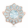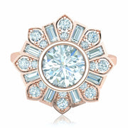 Bursting with beauty, a blooming halo of layered round diamonds elevates and surrounds your 1 carat round center diamond. The Clara Ring is the purest realization of opulence in design. This setting is custom made to fit your beautiful center stone.