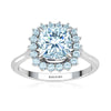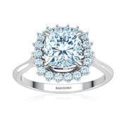 This Halo diamond ring epitomizes glamour and romance. It features a brilliant cushion-cut diamond in a four-prong setting floating above a halo of 18 glittering round diamonds. This striking floral inspired design highlights the purity of the gems and the beauty of this simply beautiful ring. This halo ring has a 1.0 carat cushion shaped CanadaMark™ Conflict free diamond with F color, SI1 clarity, and Very good cut diamond.