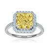 A scintillating 1.0 carat fancy yellow asscher-shaped diamond is surrounded by a halo of round brilliants in this breathtaking ring. The fiery yellow diamond at the center of this gorgeous ring is surrounded by ethically mined round diamonds. Setting includes side diamonds equal 0.30 carat total weight.