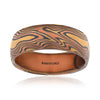 The Beaumont Mokume Band is a classy and stylish ring inspired by the beauty of nature and its vibrant colors. This stylish ring is a beautiful blend of red, rose gold with palladium. The resulting organic pattern is an attractive pulsating color that is vividly appealing in 8 mm.