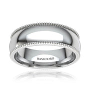 The Moldoveanu-inspired wedding band is an alluring and attractive ring features a 7mm Comfort Fit Milgrain Band. With a slightly domed center band framed by milgrain detailing at the edges, this ring is like a lush mountain with amazing views. The high gloss finish of this comfort-fit band makes for a striking look for that mod
