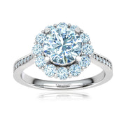 This Signature Fleur Blossom Diamond Ring has a 0.75 carat round shaped CanadaMark™ Conflict-free diamond with G color, SI1 clarity, and ideal cut diamond. Haloed by round diamonds in a shared prong setting. As lustrous as a flower in bloom, the Fleur Blossom Ring is a display of style and sophistication.