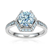 Both chic and sophisticated, this lovely hexagonal halo ring is set with a 0.75 carat round shaped CanadaMark™ Conflict free diamond with G color, SI1 clarity, and Very good cut diamond with pavé-set diamond accents on either side of the center diamond.