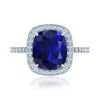 Elegant and dazzling, this Sapphire Ring is for the woman of glory. It features a 8.0 x 6.0 mm Blue Cushion Sapphire, surrounded by a stunning halo of diamonds that embrace the sapphire gem. Diamond accents on the band add a truly glamourous effect. This is a true reflection and embodiment of the strong woman whose finger this ring will grace. A truly spectacular ring!